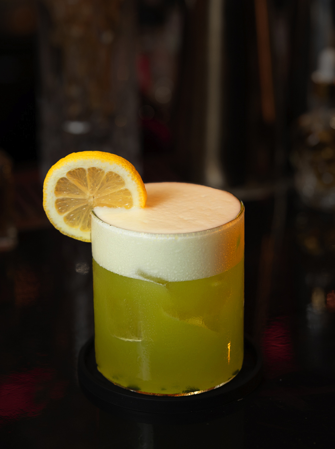 "Woodford reserve" bourbon, "Midori" liquor, yuzu puree, lemon juice and foamer